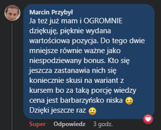 Piotrek: Jasny i czytelny przekaz. Pozwala zrozumieć sprzedaż kursów i nabyć wiedzę teoretyczno-praktyczną.